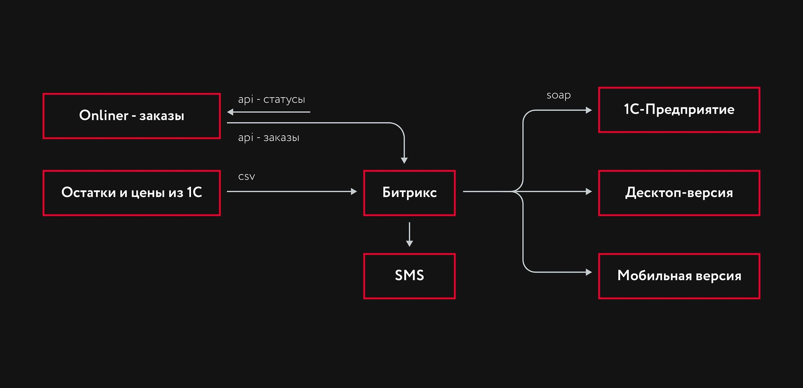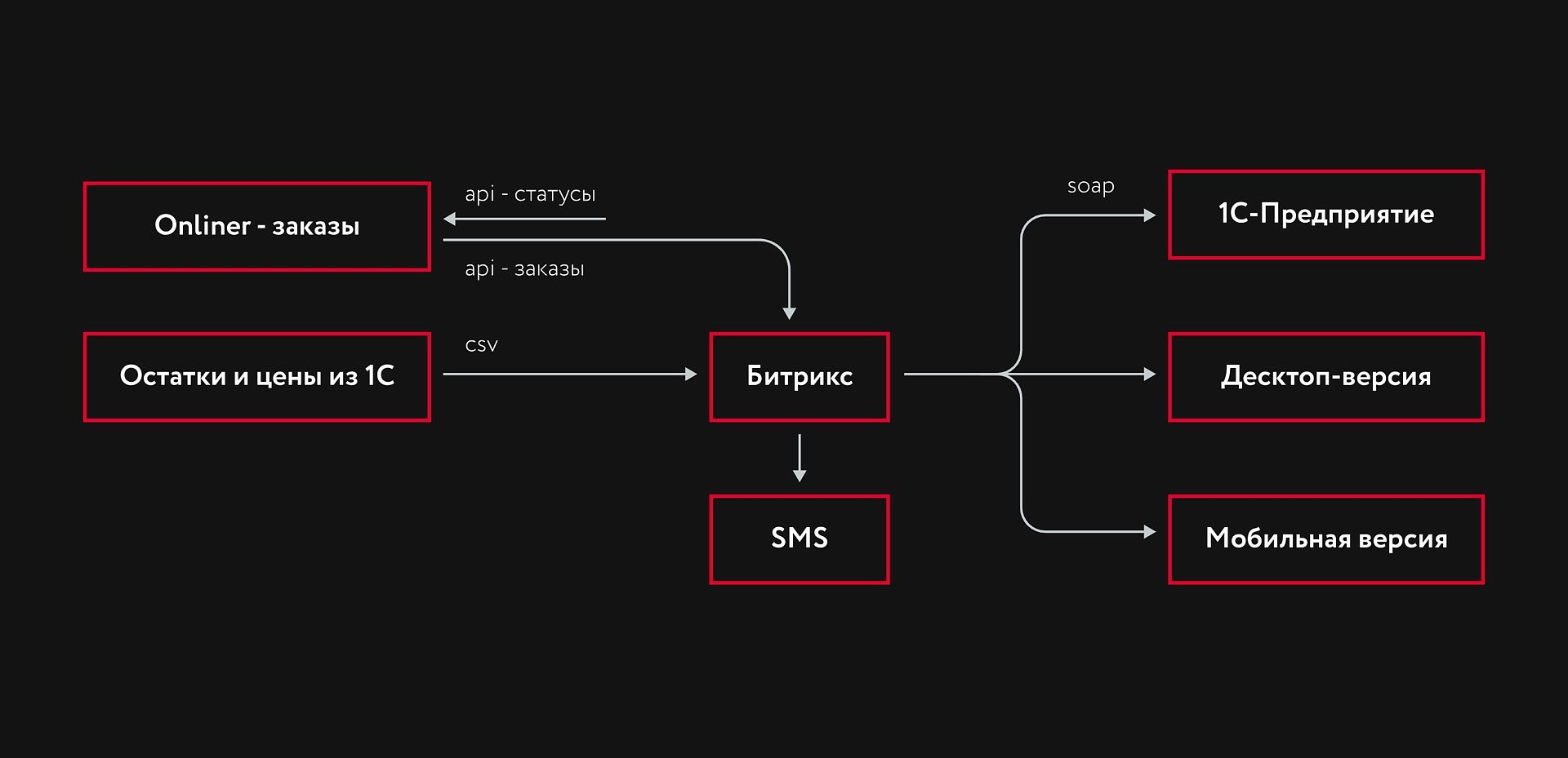 Объединить интернет-магазин, 1С и внешние сервисы в единую систему, чтобы обеспечить стабильную работу цифровых процессов, автоматизировать обмен данными и поддержать удобный путь оформления и обработки заказов.