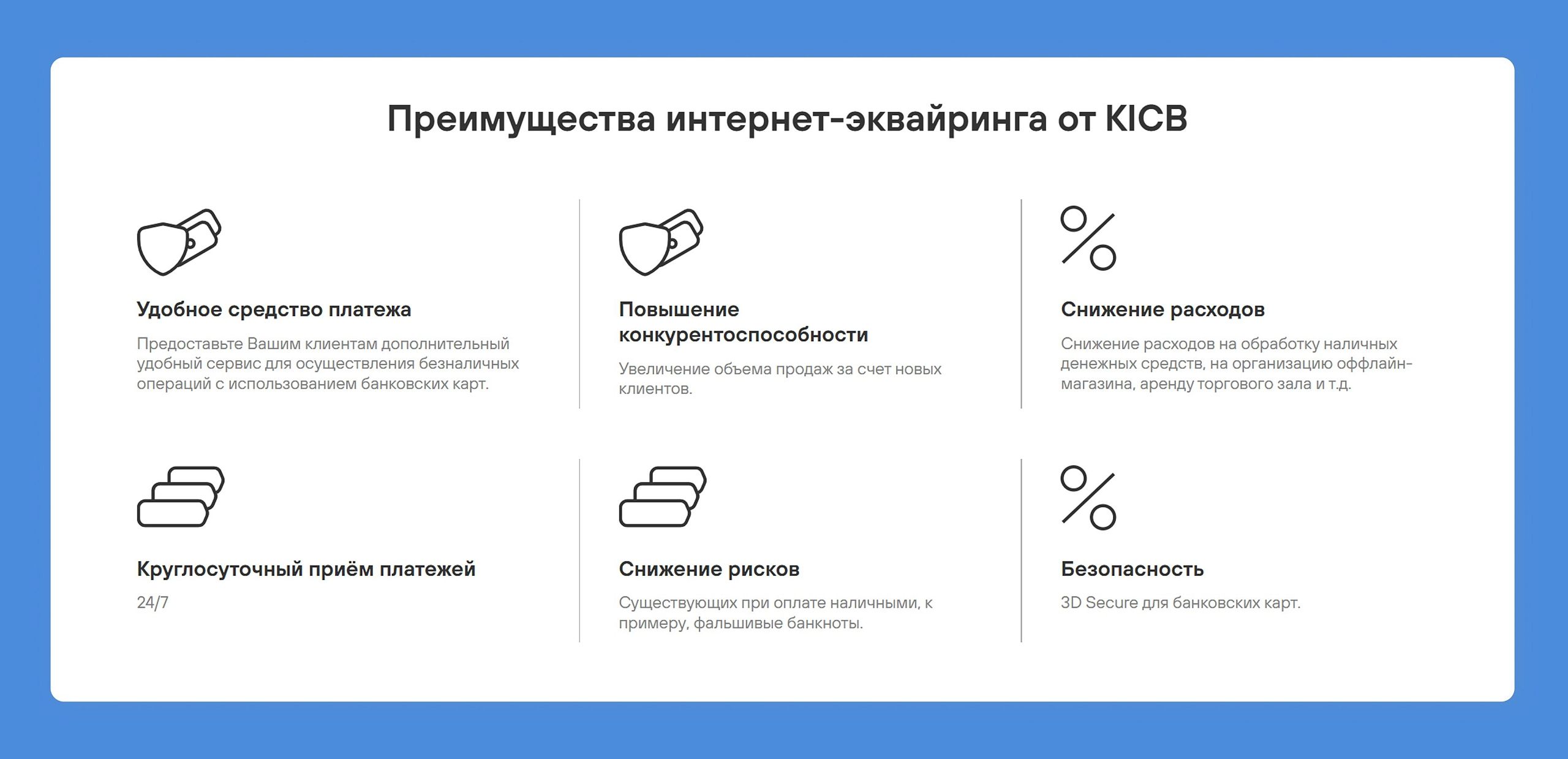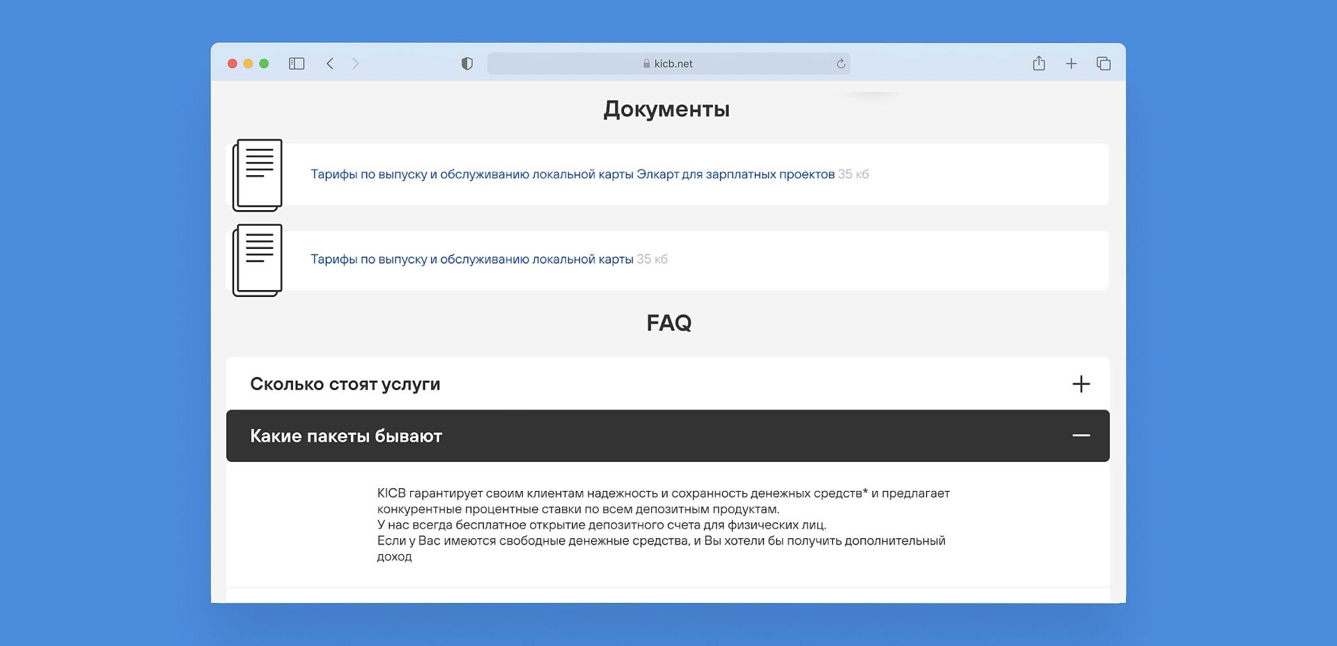 KICB — инвестиционно-кредитный банк, работающий на рынке с 2001 года. Обслуживает частных и корпоративных клиентов, предлагает широкий спектр финансовых услуг.