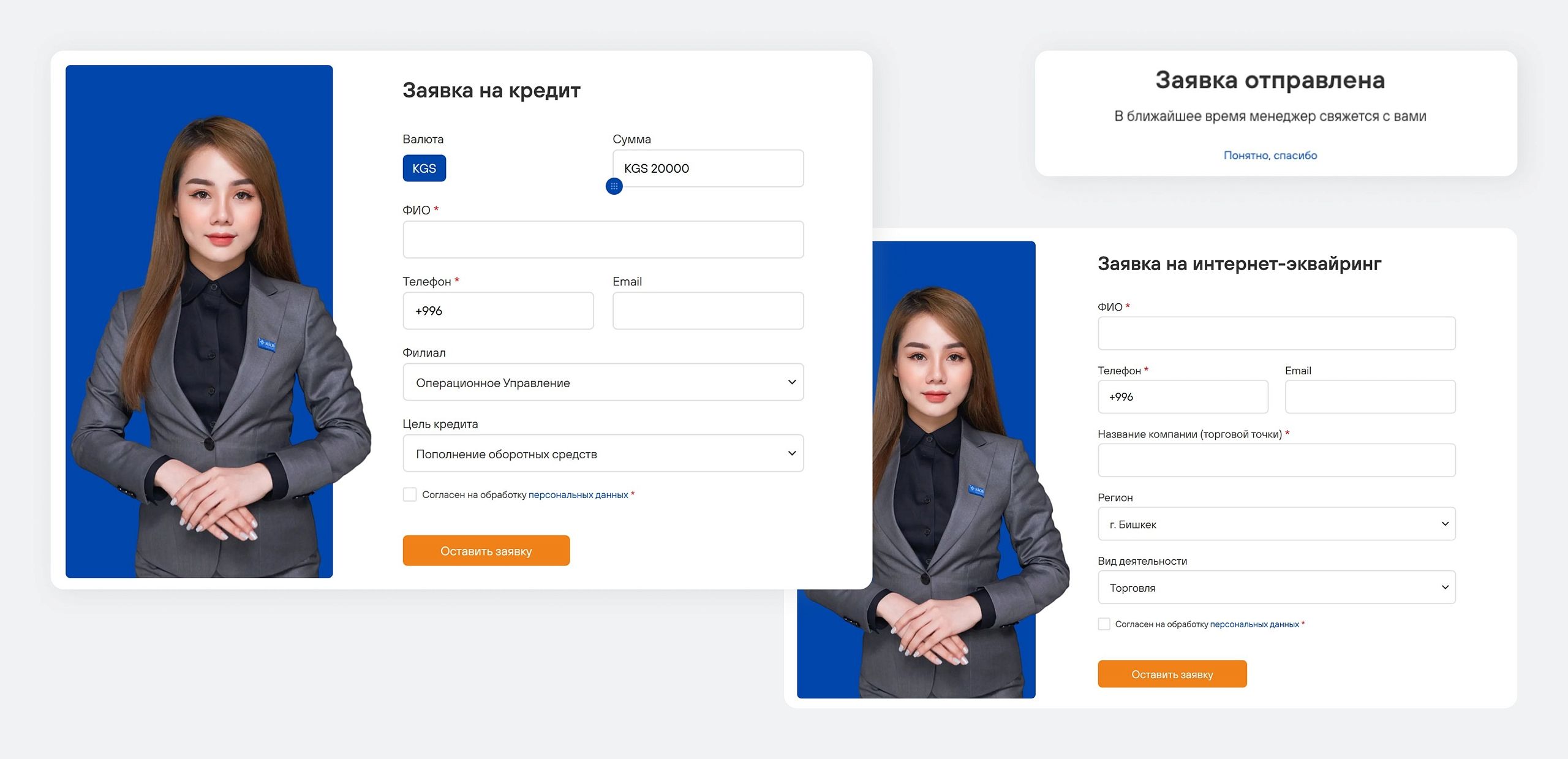 Для разных продуктов реализовали отдельные формы, которые открываются в поп-апах. Все заявки сохраняются на сайте и отправляются на почту сотрудников банка — ни одно обращение не теряется.