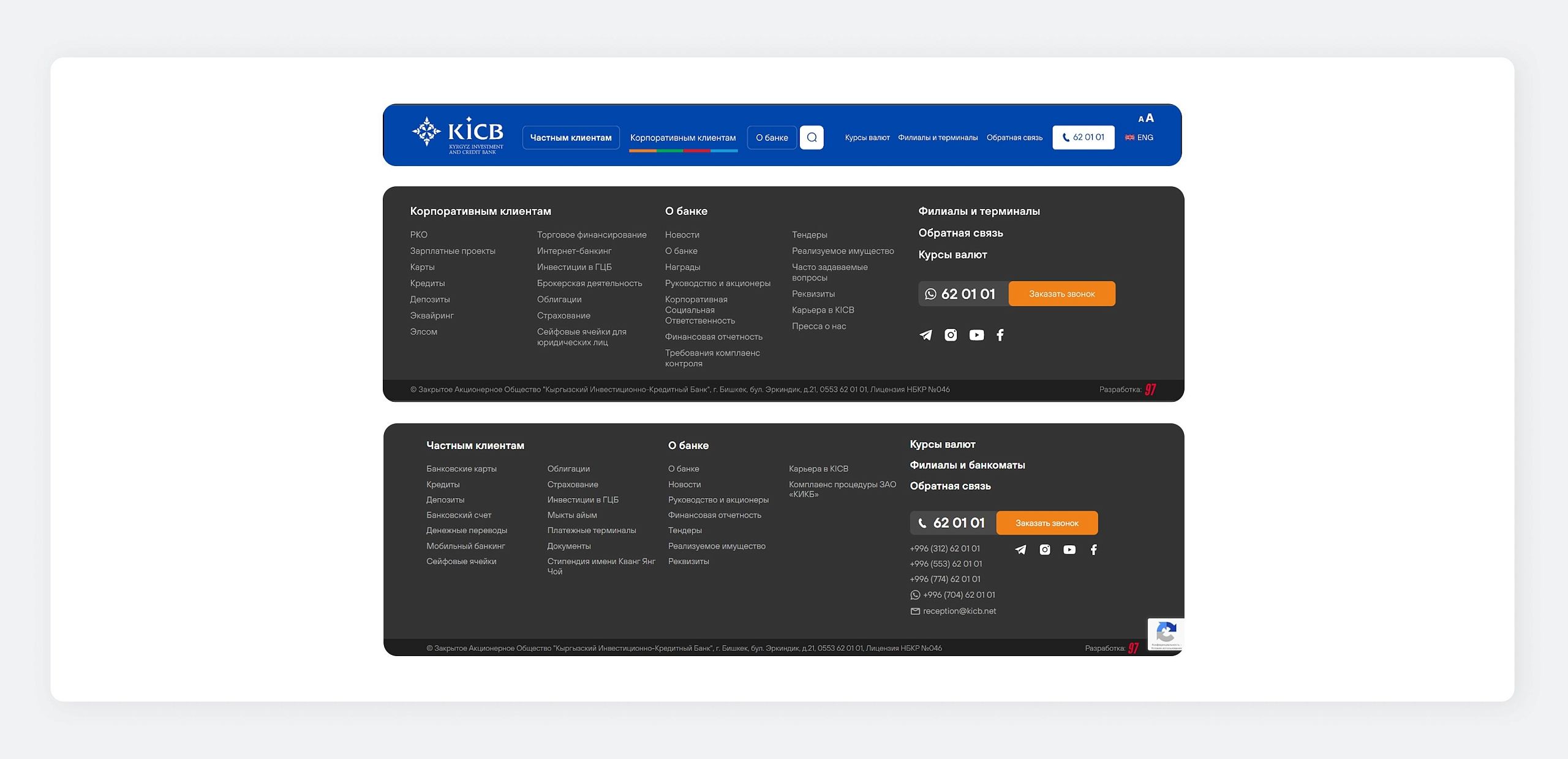 На первом этапе настроили шаблон и базовые элементы сайта — хедер и футер. При этом футер сделали адаптивным: его вид меняется в зависимости от раздела (для частных или корпоративных клиентов).