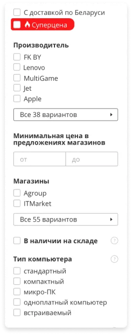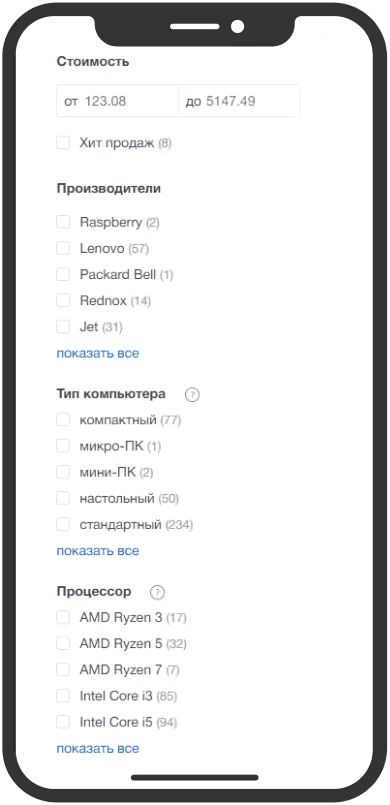 Для гипермакета крайне важно создать удобный подборщик, а это значит, что нужно было решить, как это всё будет управляться. Нужно было реализовать следующий функционал: