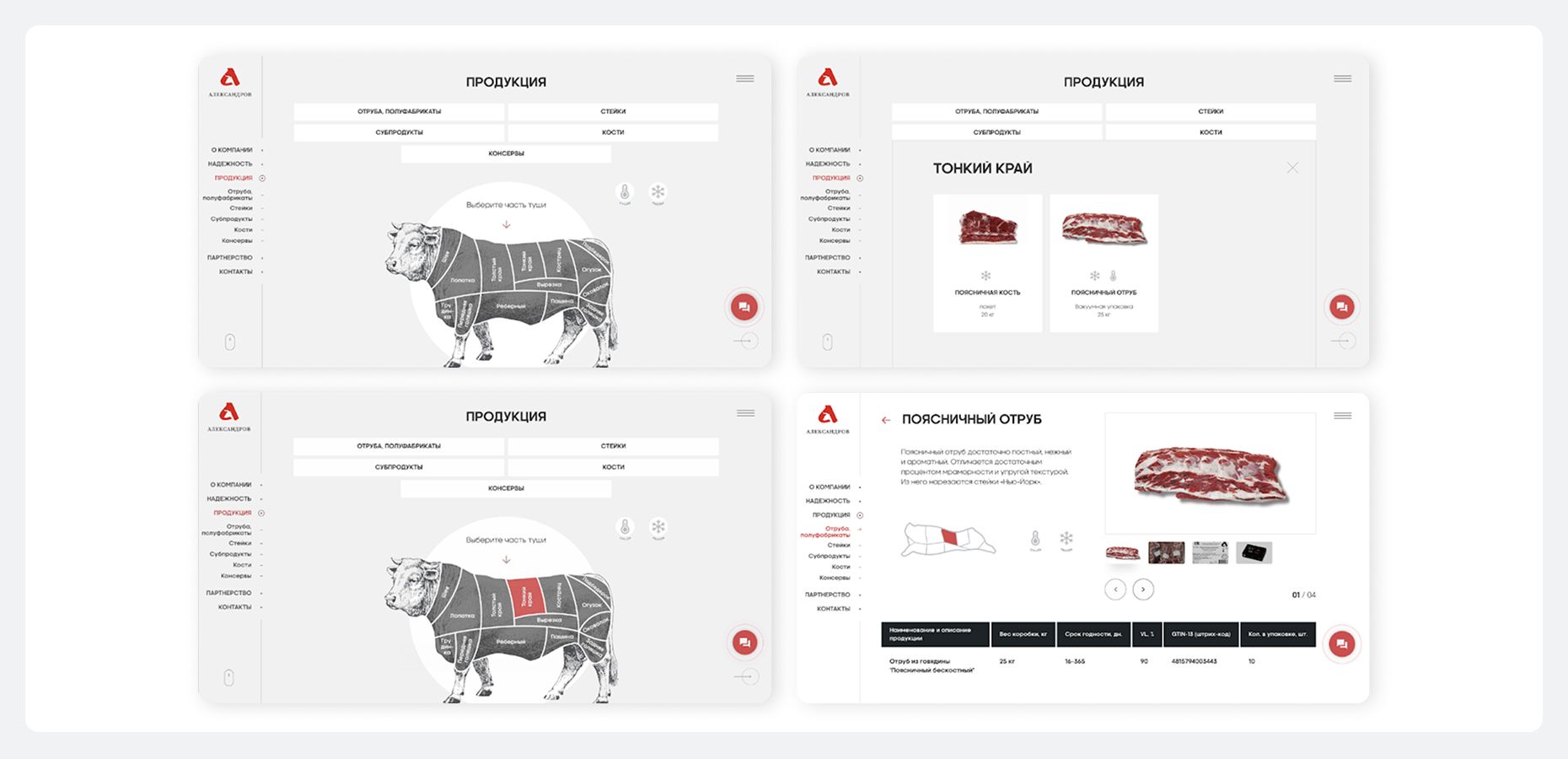Каталог — вторая особенность проекта. Вместо стандартного списка или сетки товаров реализовали интерактивного быка. Пользователь может выбрать часть туши непосредственно на изображении, после клика он выбирает конкретную позицию и переходит в карточку товара с подробной информацией. Такого решения не было ни у кого из конкурентов.