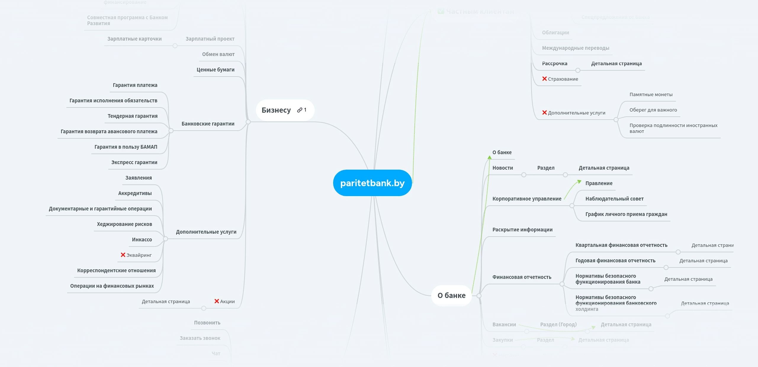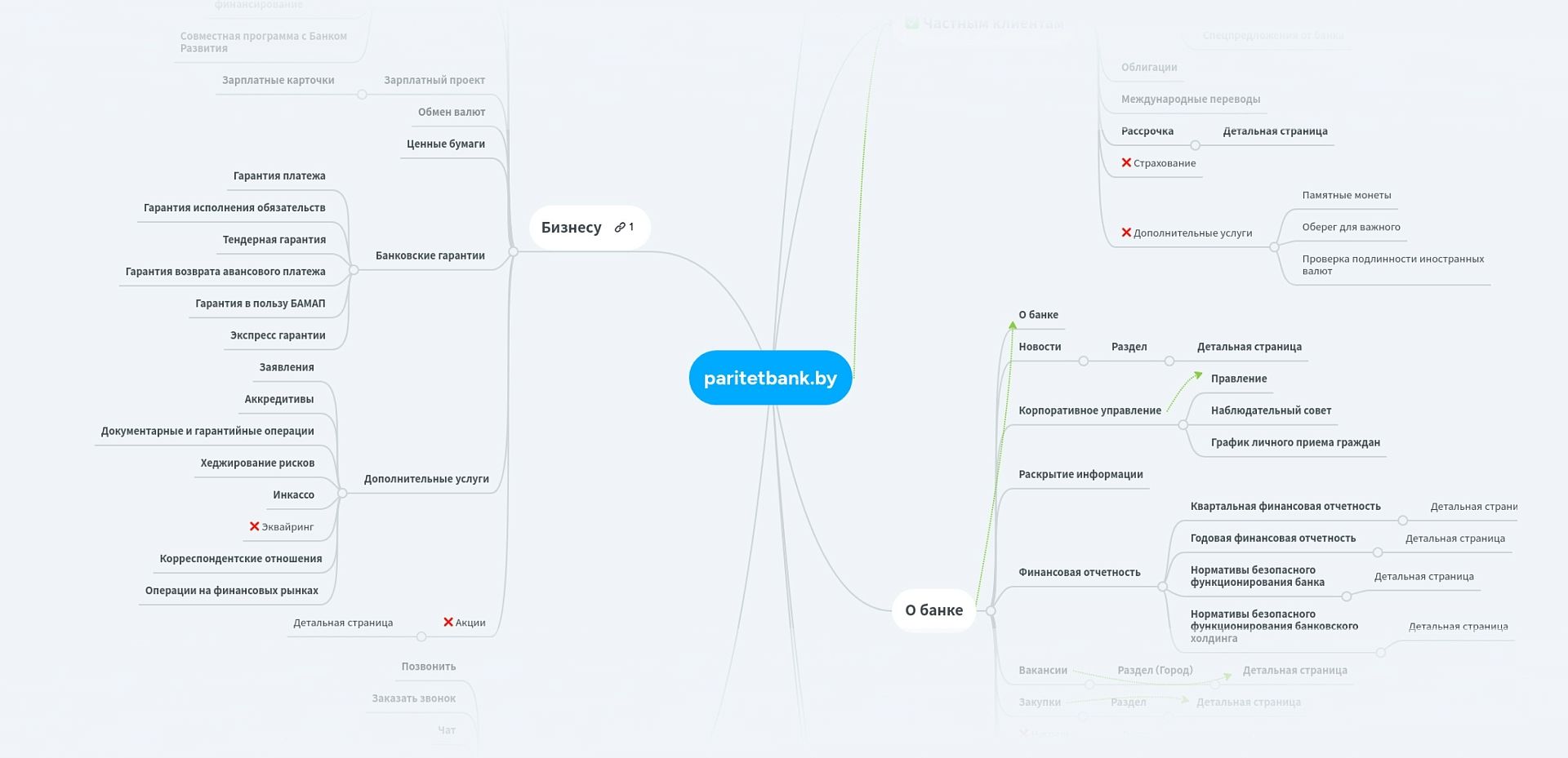 В обязательный минимум вошли страницы, требуемые регулятором, и продуктовые разделы. Самым объёмным оказался раздел «О банке» — более 12 разделов и десятки подразделов, обязательных по требованиям «Национального банка».