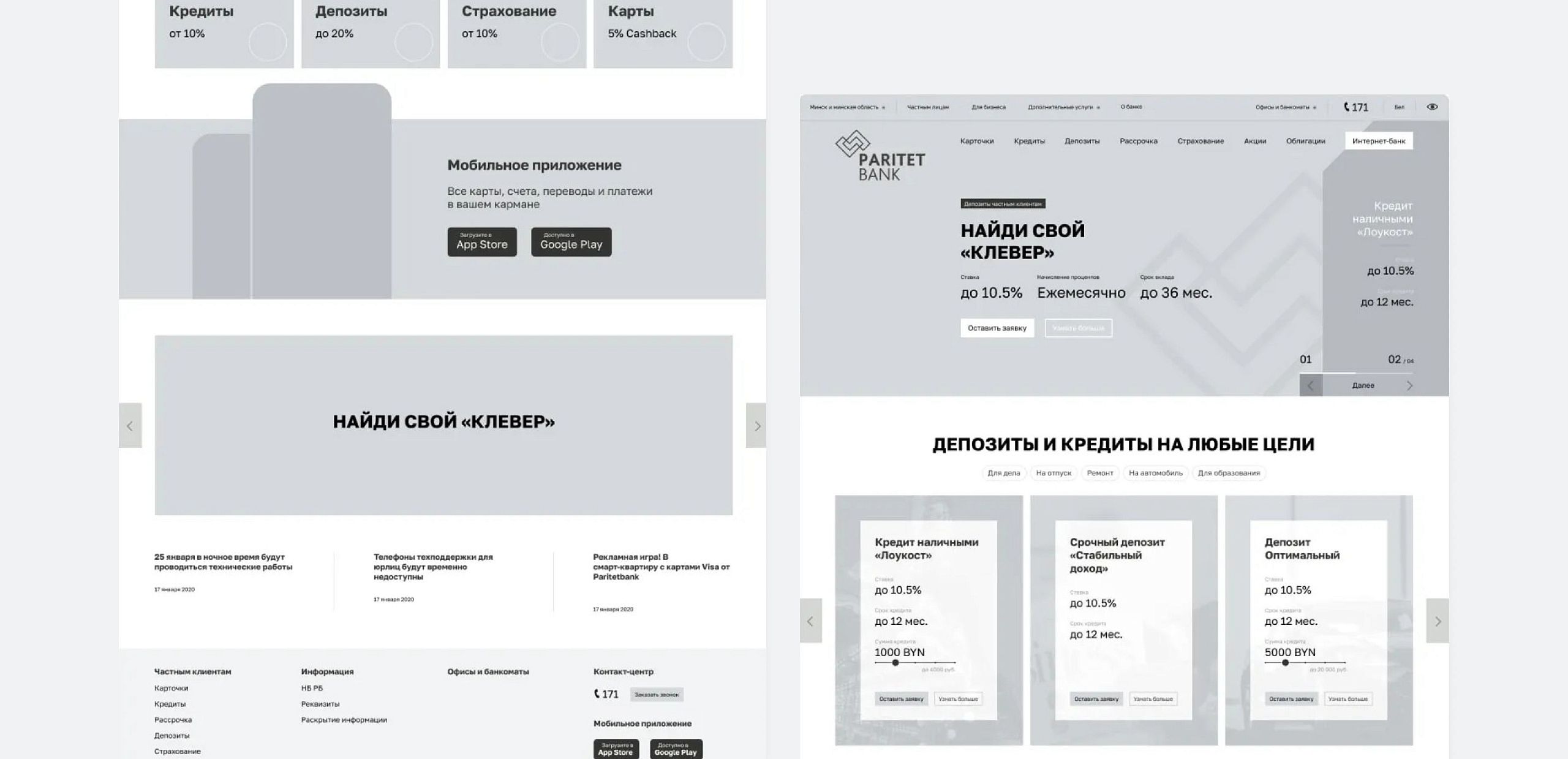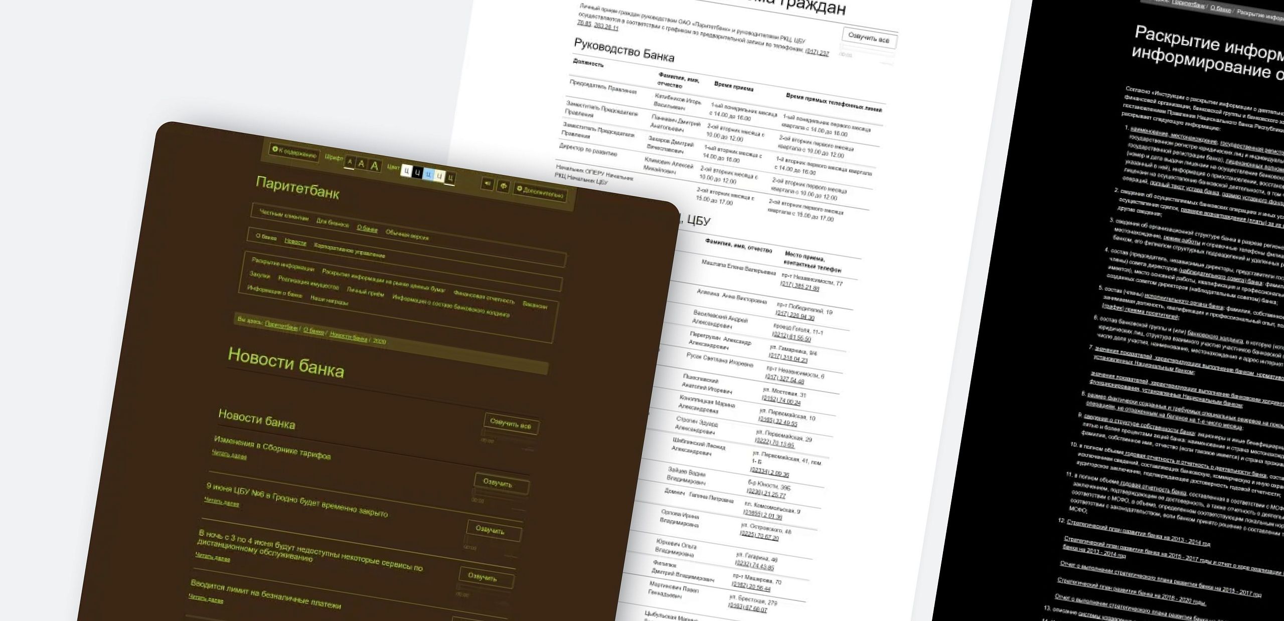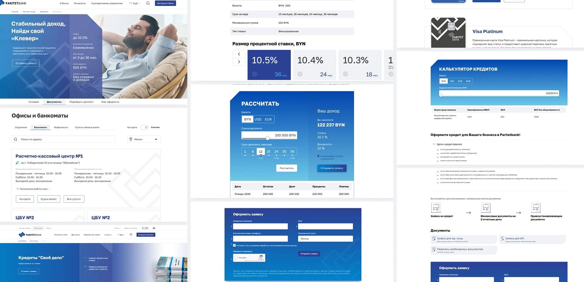 Сеть "Паритетбанка" — это 49 точек присутствия по всей территории Республики Беларусь. В банке трудоустроено более 500 сотрудников. С 2020 года в банке произошли кардинальные изменения, и требовалось обновление всей веб-платформы.