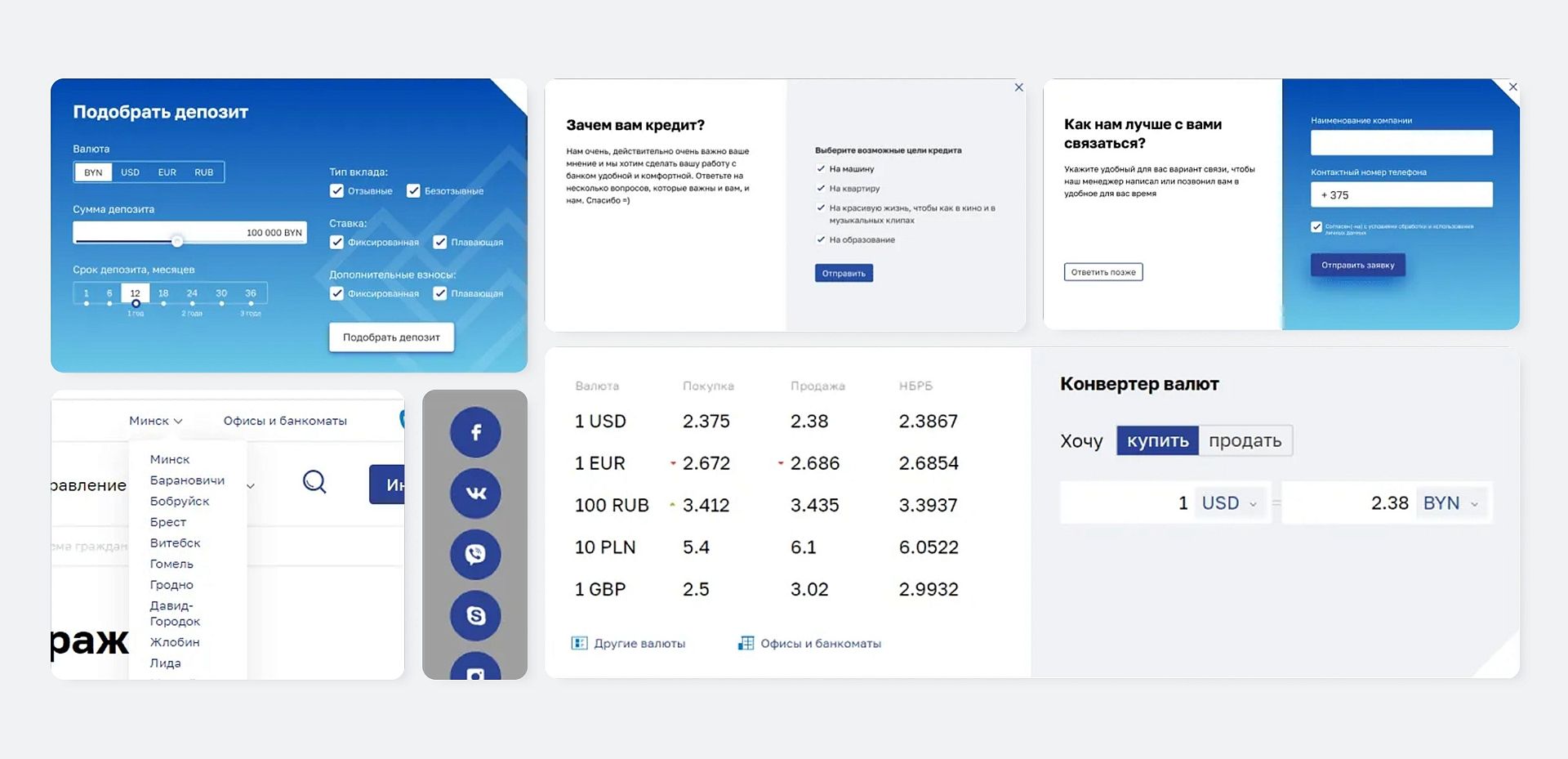 Подборщик депозитов и кредитов, калькуляторы для депозитов, кредитов, РКО. Лидген-форма, свой виджет мессенджеров, геолокация, конвертер валют, разбивка курсов валют по филиалам, конструктор форм, интеграция форм с CRM, конструктор всплывающих окон.
