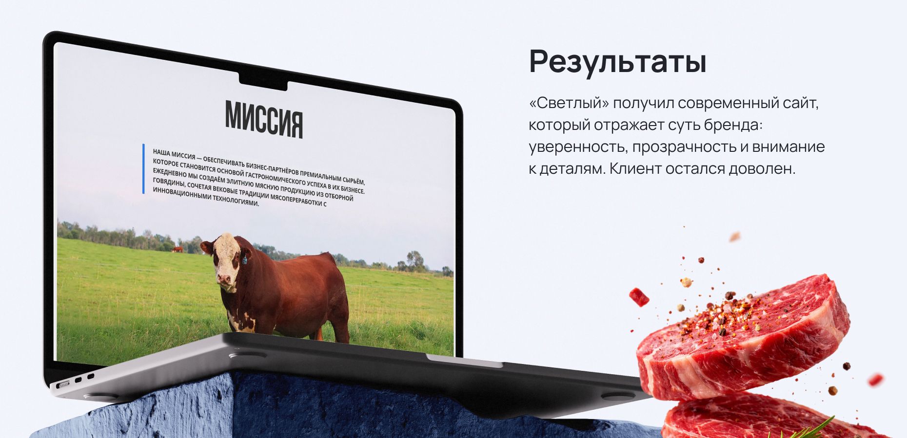 Важный акцент — на качестве продукции и атмосфере производства. Сайт должен был передавать главную идею бренда: «Говядина для тех, кто ценит качество».