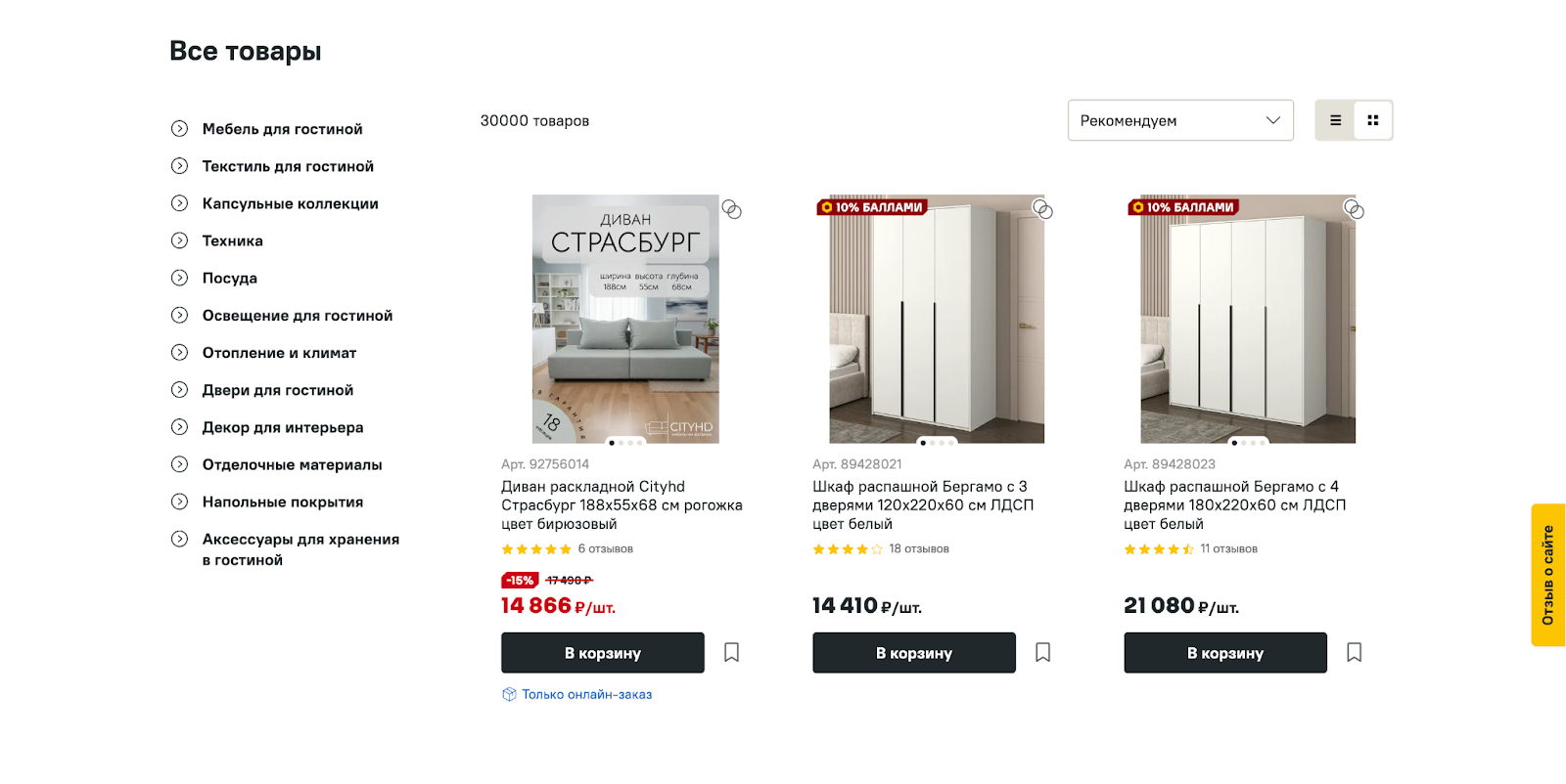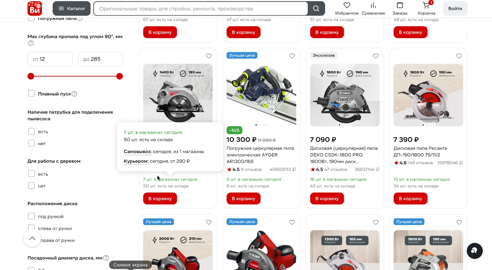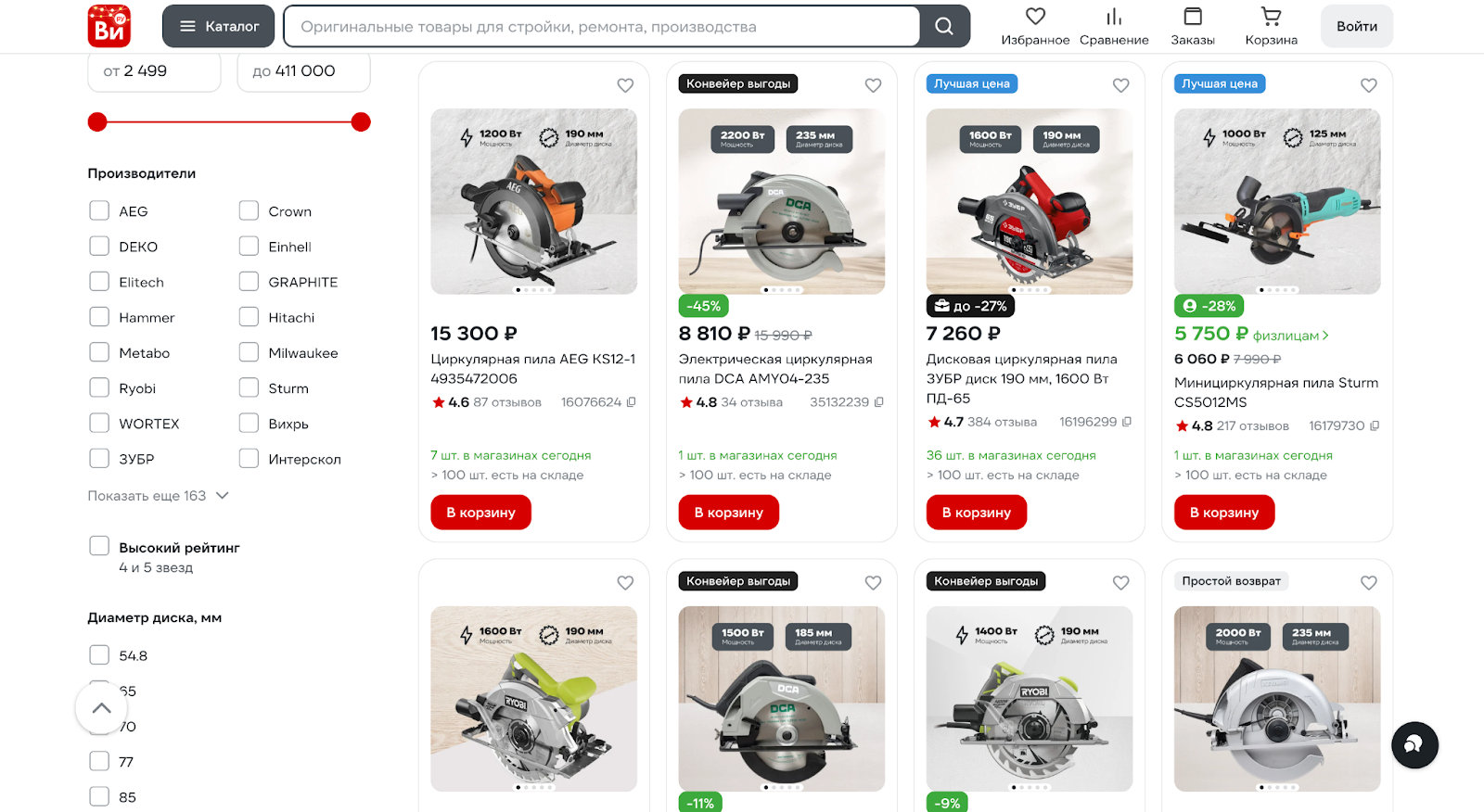 Прямо в листинге выводится информация о наличии на складах, чтобы покупатель сразу видел, можно ли заказать товар.