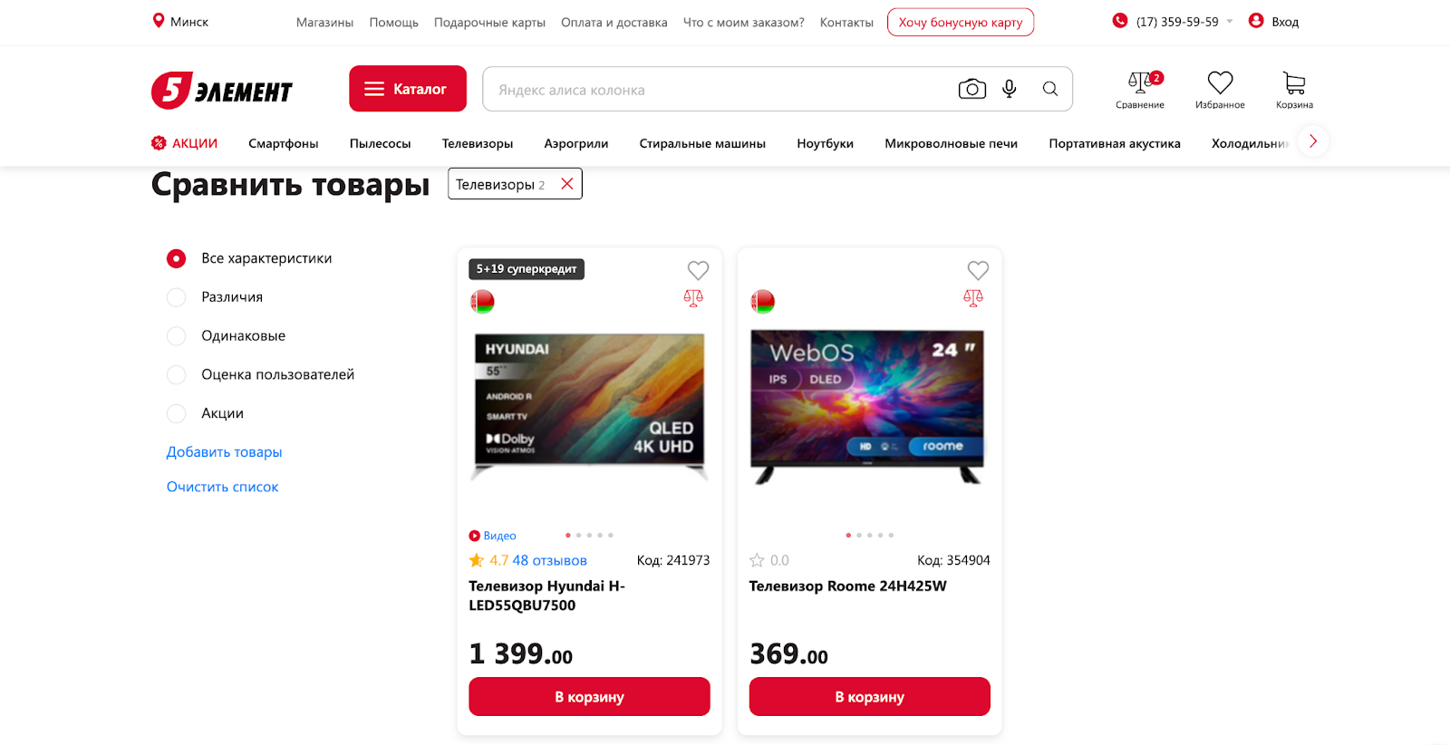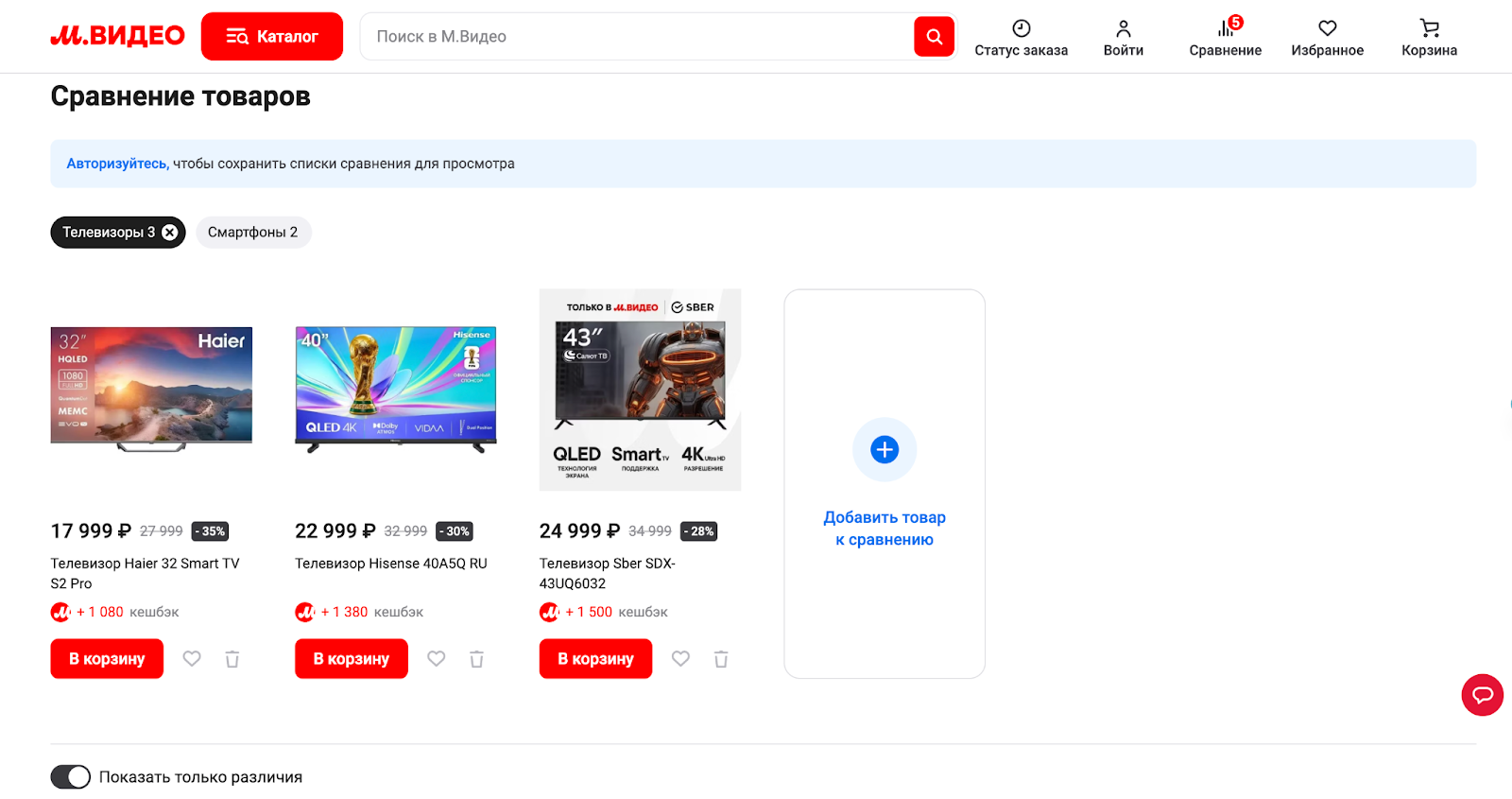После добавления система автоматически разбивает товары по категориям. Если сравниваются телевизоры, в списке будут только телевизоры, если телефоны — только телефоны.