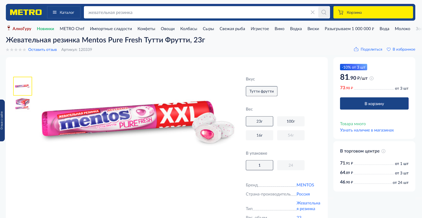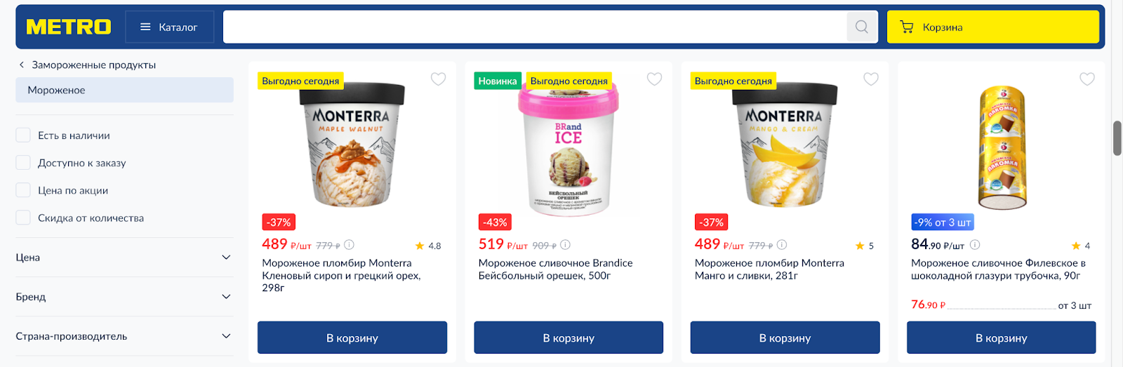 Цены считаются динамически. Если у товара есть старая цена, она зачеркивается, а рядом выводится новая. Итоговая сумма пересчитывается автоматически, учитывая кратность: если товар продается упаковками или коробками, цена сразу показывает стоимость за нужное количество.