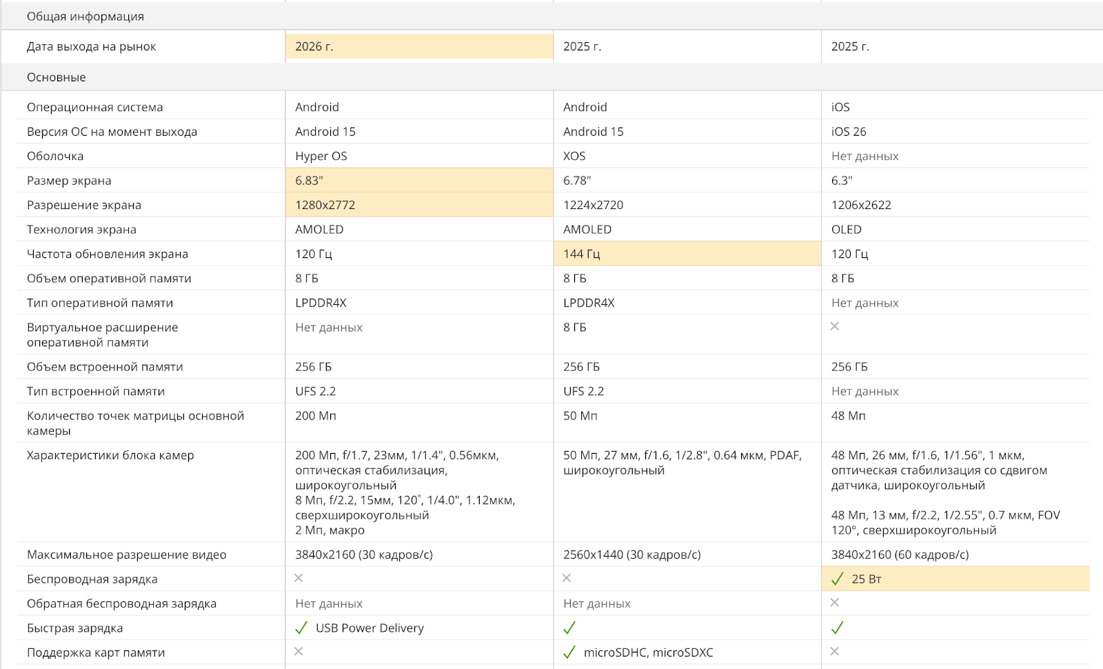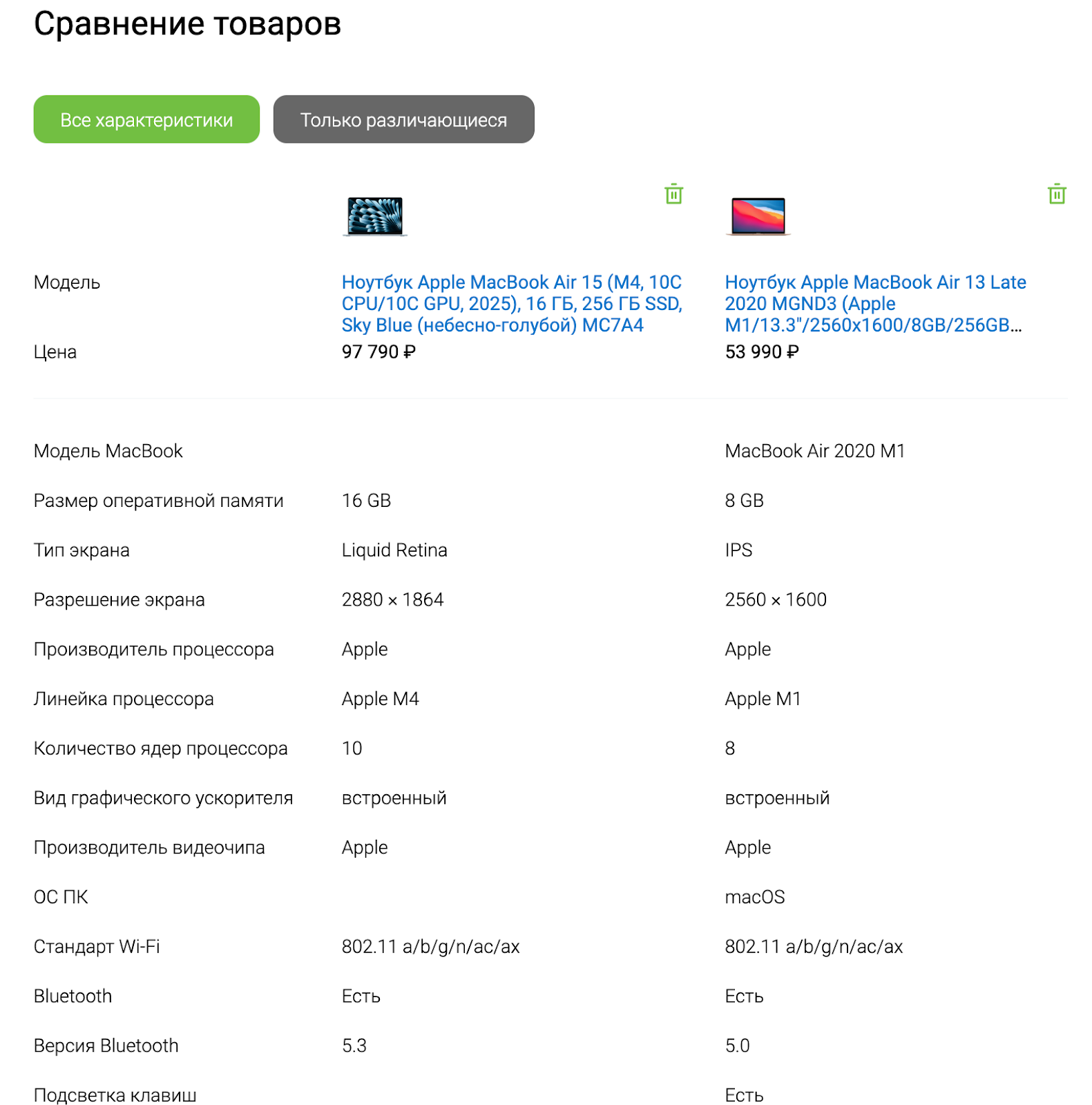 Все характеристики сравниваемых товаров выводятся в таблицу. Если пользователь нажимает «Показывать только различия», остаются только строки, где есть отличия.
