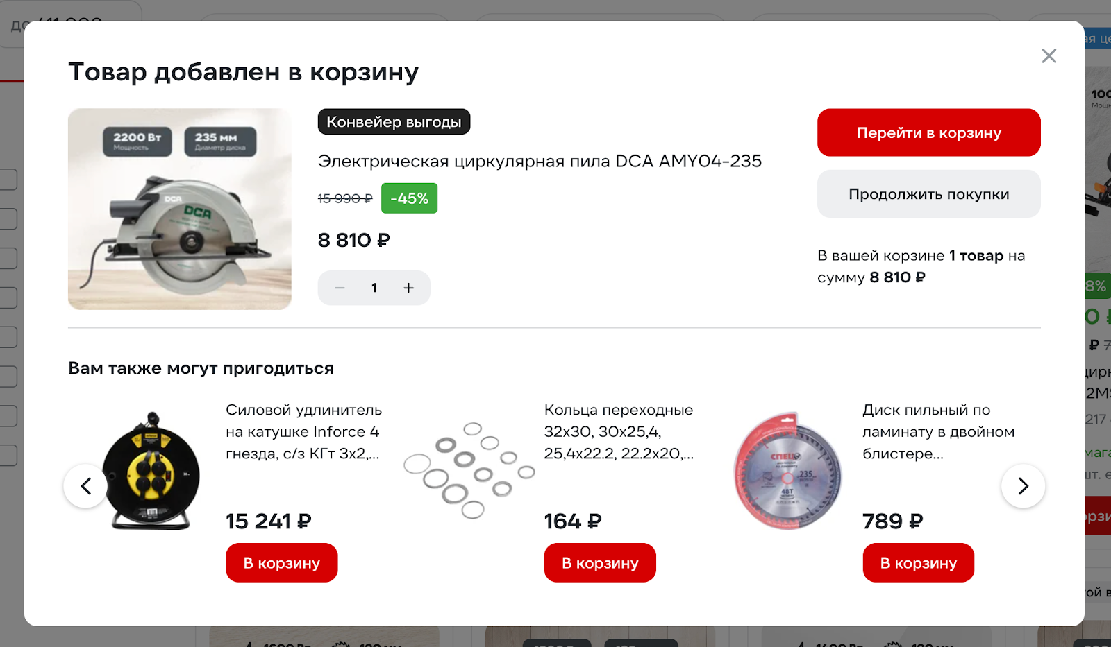 Клик по «В корзину» вызывает поп-ап с выбором количества и апсейлом. Система сразу предлагает расходники и сопутствующие товары. Логика подбора работает так же, как в карточке товара и корзине: подтягиваются допы, которые чаще всего покупают вместе.