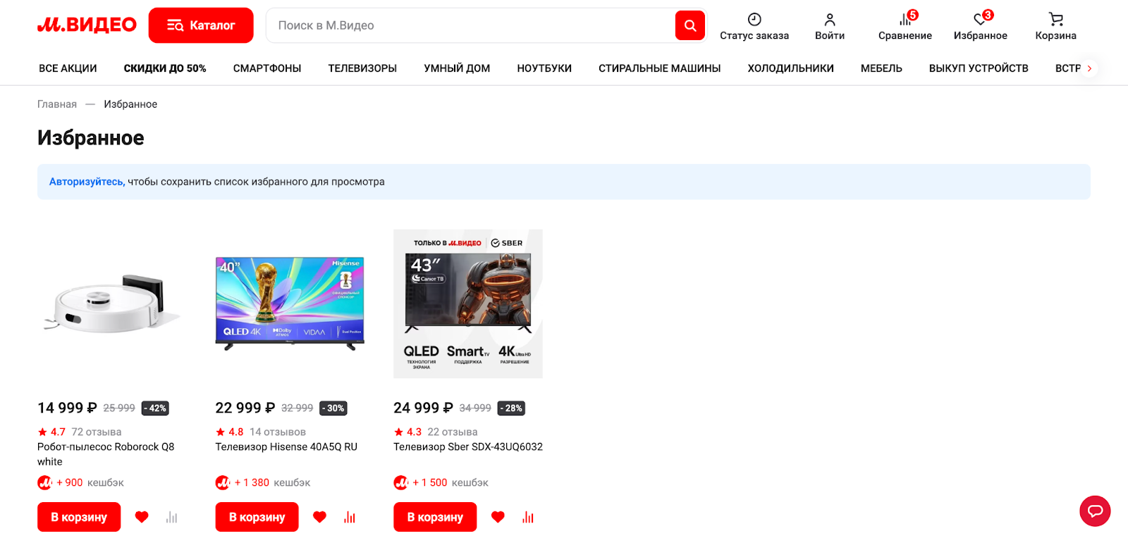 Клик по «В избранное» — добавляет товар в список сохраненных. Клик по «Сравнить» — отправляет товар в список сравнения.