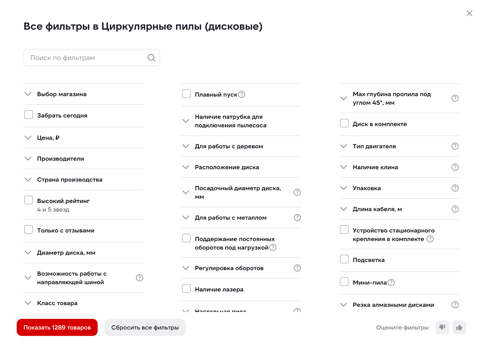 Он отображается по клику на специальный баннер и содержит несколько вкладок. В зависимости от логики магазина, эти вкладки могут включать разные параметры сегментации товаров.